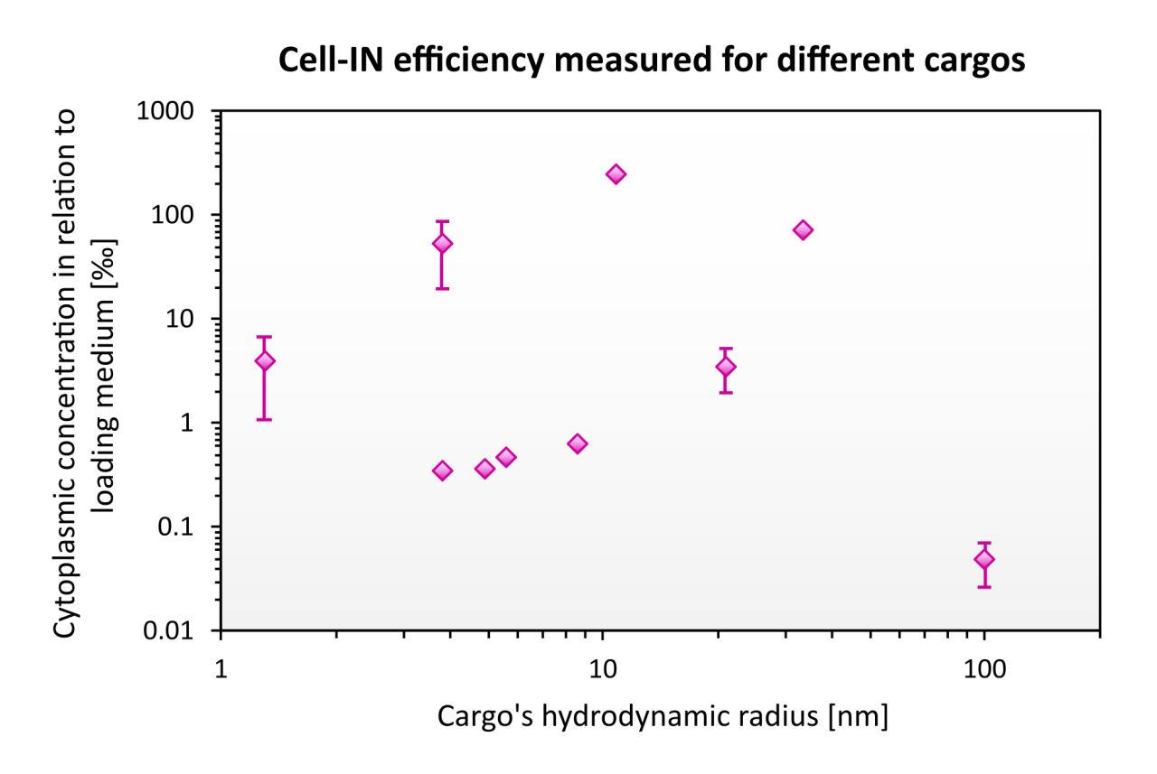 We examined the effectiveness of colloidal loading solutions of varied compositions, including various types and sizes of polymers building osmotic pressure. We used confocal imaging coupled with fluorescence correlation spectroscopy to evaluate the introduction of polymers, proteins, nanoparticles, and DNA plasmids (cargos of sizes 1 – 175 nm) to cells representing eight cell lines: cancer, normal, epithelial, and mesenchymal ones.