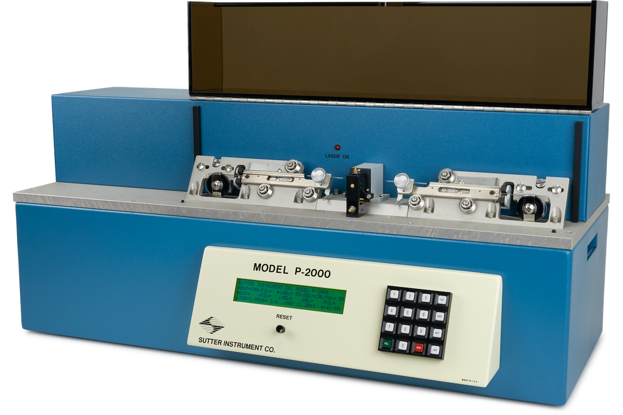 P-2000 ir Sutter Instrument CO2 lāzerbāzēts mikropipetes velcējs — vienīgais velcējs, kas spēj strādāt ar kvarca (kausēta silīcija dioksīda) stiklu. Pieejams divās konfigurācijās (P-2000/G OD ≥ 0,6 mm; P-2000/F OD < 0,6 mm), izgatavo mikropipetes, patch clamp pipetes, optiskās šķiedras un elektrospray/nanospray galus ar nepārspējamu precizitāti.