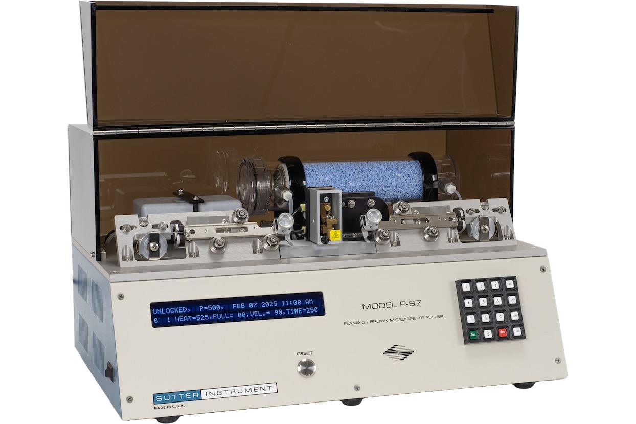 P-97 ir Sutter Instrument pārbaudītais Flaming/Brown mikropipetes velcējs — ātrumu uztverošs, programmējams velcējs ar mitruma kontroles kameru, 100 programmu atmiņu un 8-rindu programmēšanu. Velk visus stiklus izņemot kvarcu; galu diametri 0,06–3 µm. Ideāls patch clamp, intracelulārajai reģistrācijai un mikroinjekcijai.