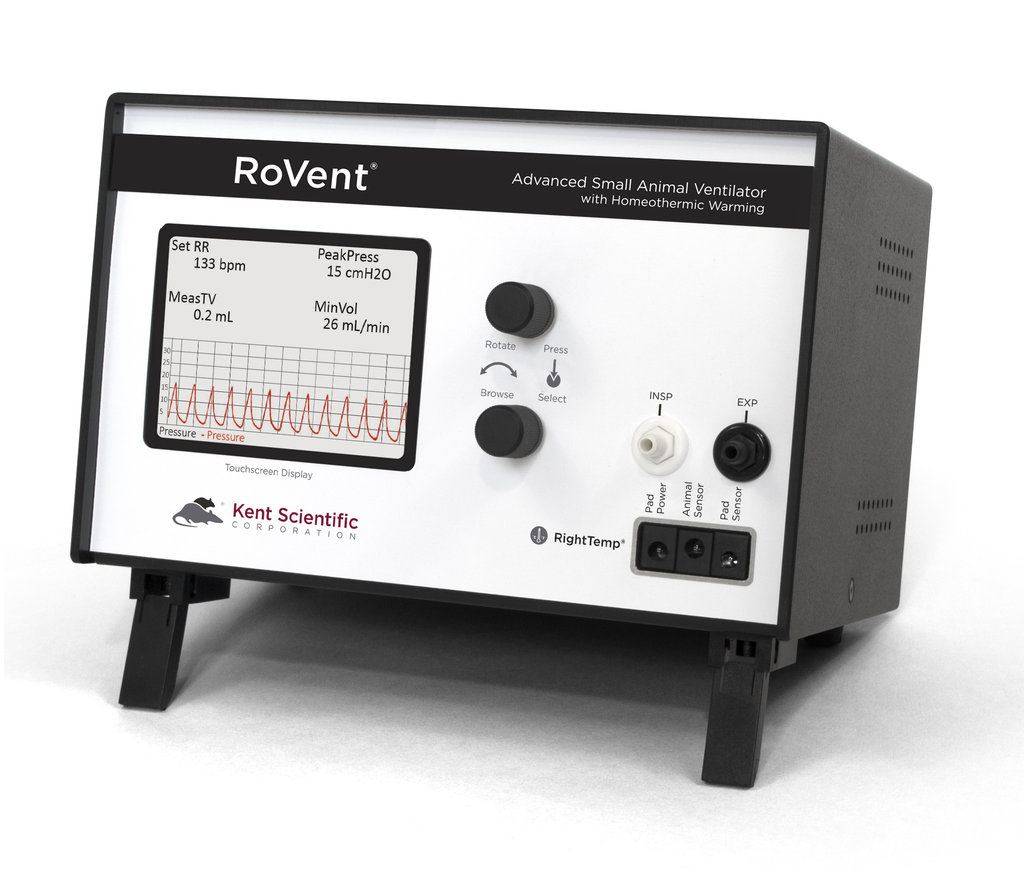 Small Animal Ventilator RoVent® is ideal for mice, rats, and guinea pigs weighing up to 1250 grams. The ventilator is fully automatic; simply enter the animal's weight and press the Run button. Ventilation control is achieved by adjusting volume or pressure. The advanced RoVent® model allows measurement of several physiological parameters of the anesthetized animal. Integrated PEEP, sigh breaths, and other advanced features make RoVent® suitable for a wide range of procedures.